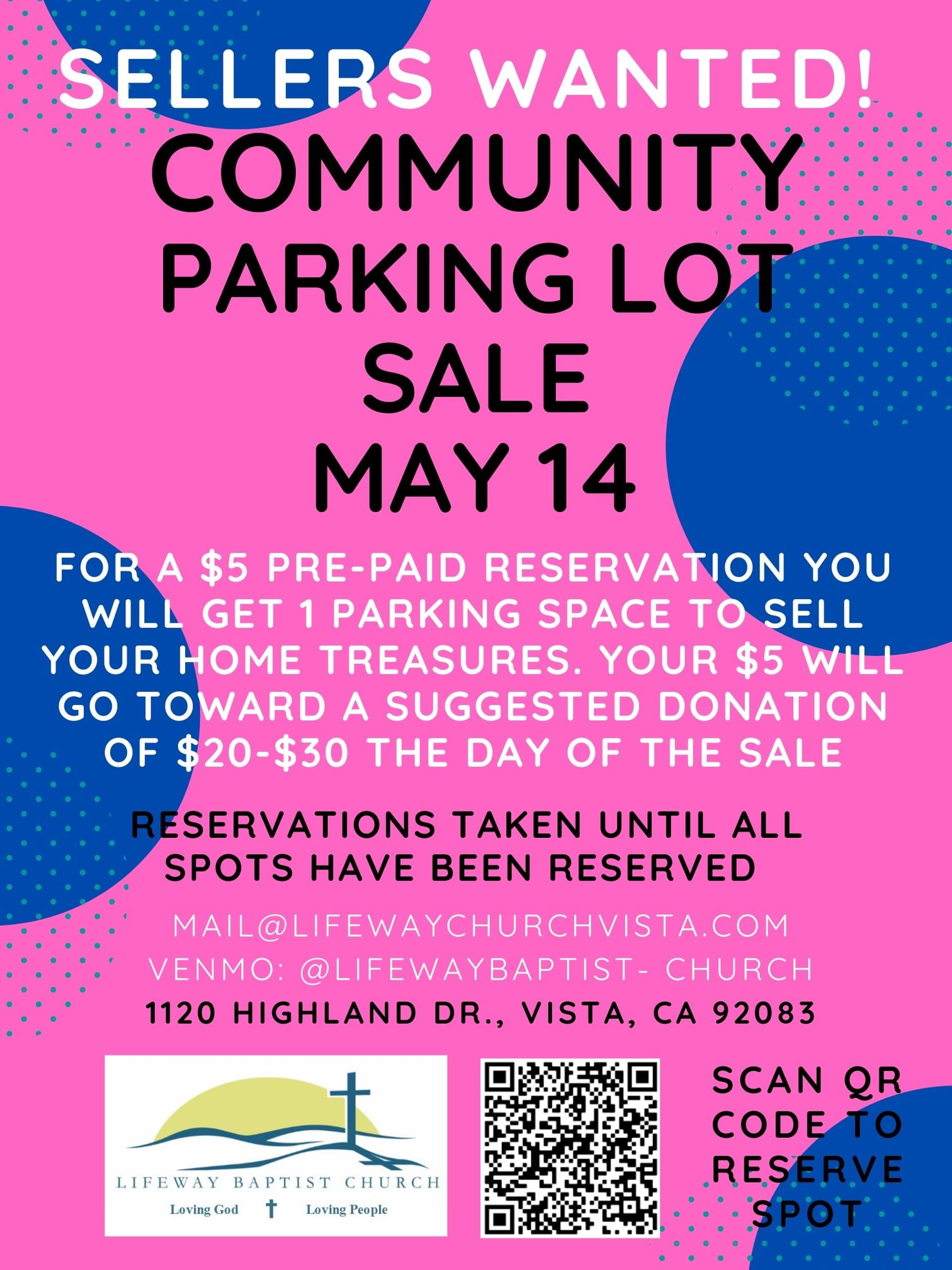 Sellers wanted! For a $5 pre-paid reservation, you will get 1 parking space to sell your household wares or products. Your $5 will go towards a suggestion donation of $20-$30 the day of the sale.